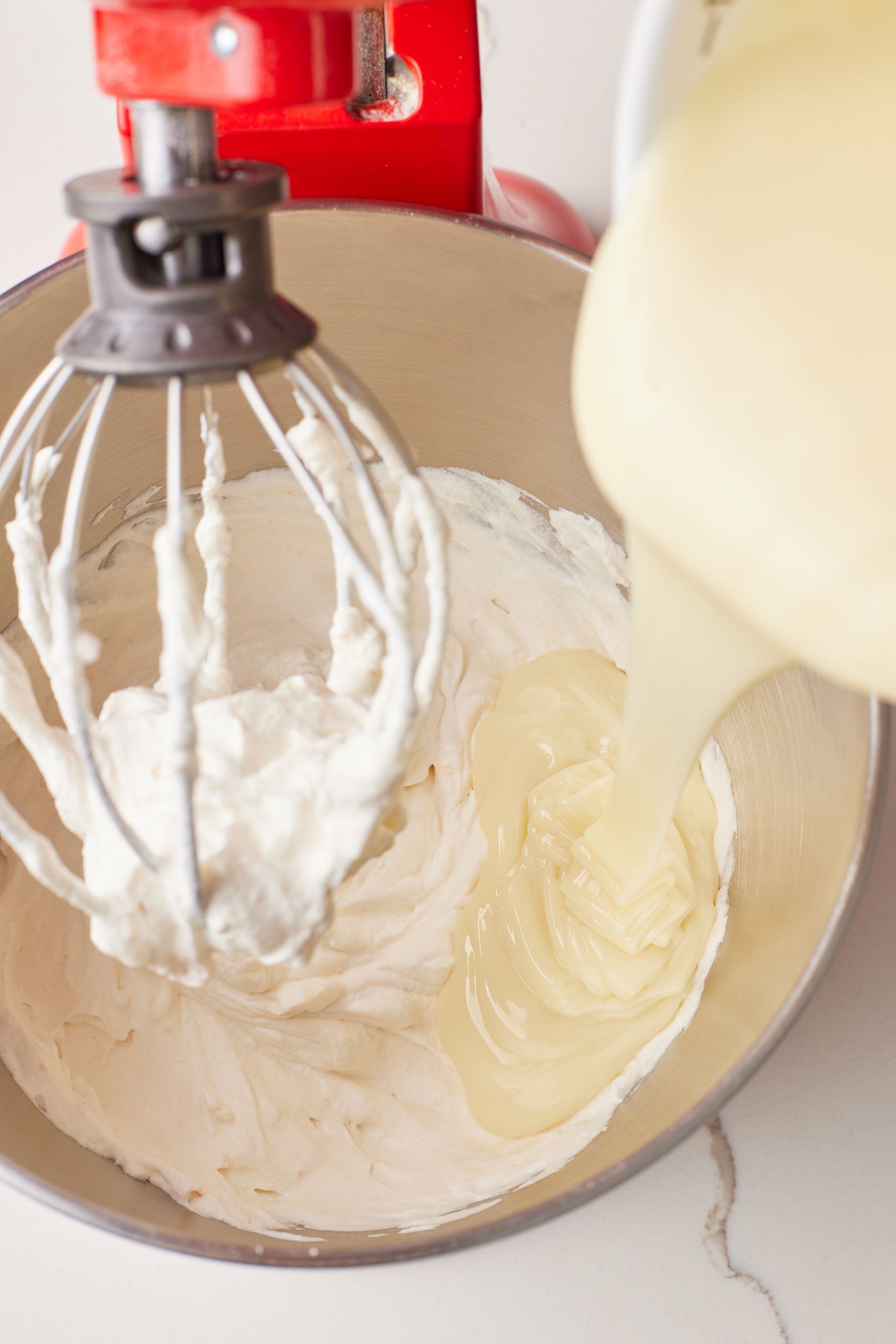 Turn off the mixer, add the condensed milk, then whisk on high speed until thick and stiff peaks form.