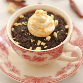 The Chocolate & Peanut Butter Mug Cake is gluten-free, dairy free, and vegan. I am crazy for these two flavors right now. It’s a harmonious blend of sweet chocolate and salty peanut butter.