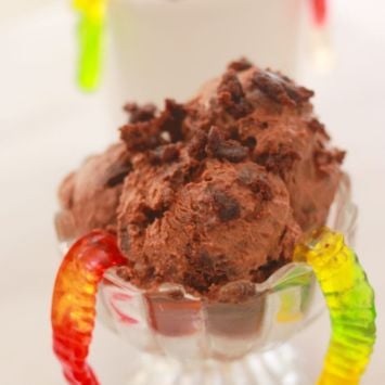 Chocolate Brownie Ice Cream (Death by Chocolate Ice Cream). It’s all in the name of this Halloween Ice Cream. Into my Chocolate Ice Cream base I added chunks of my Homemade Fudge Brownie. I like to do this because the Ice Cream softens the brownie so when you eat it you get softened fudgy lumps throughout the ice cream. It’s to die for, pun intended. Add a graveyard to the top of your Halloween Ice Cream by crumpling over more brownie and top it off with some creepy crawly worms.