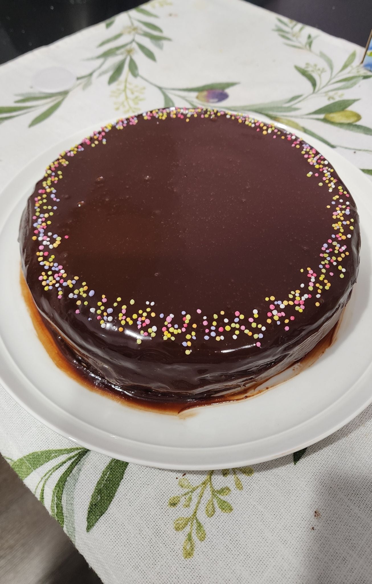 - Cover the cake with ganache: Pour the chocolate ganache over the cake and smooth the top with a spoon. Sprinkle the chopped chocolate around the edges of the cake.