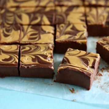 - Transfer the chocolate mixture to the prepared tin. Pour over the slightly melted runny peanut butter using a zigzag motion.