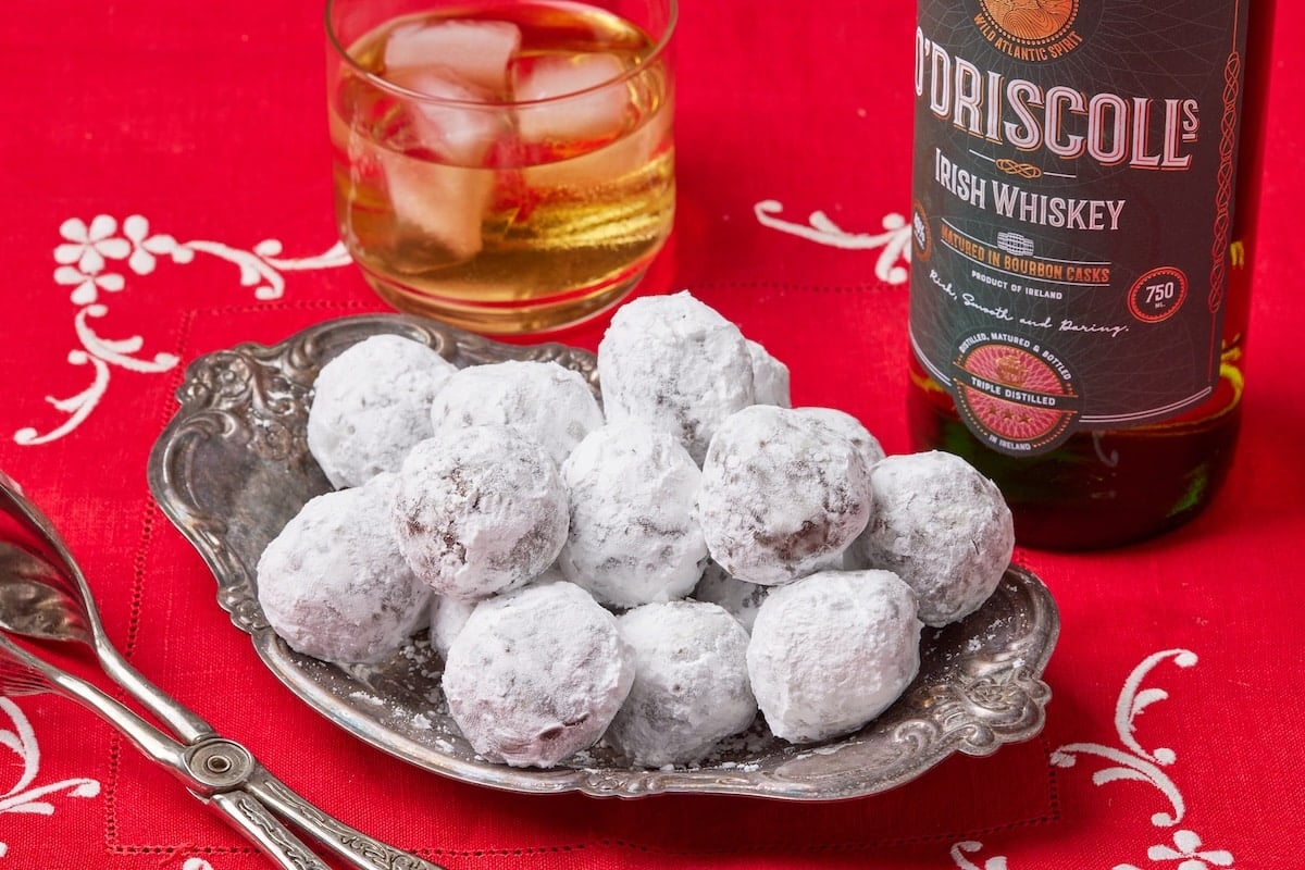 Around the holidays, I love to have truffles and candies available because after a big holiday meal, some people just like a little bite of something sweet. Irish whiskey adds instant festive vibes, and I’m proud to recommend O’Driscolls Irish Whiskey for this recipe. I’ve talked about my family connection to this respected Irish whiskey brand—it’s made by Stafford Bonded, located in my hometown of Wexford, and my cousin, Michael J. Stafford, is the managing director. O’Driscolls Irish Whiskey is a blend of golden grain and malted barley, and it’s aged in bourbon casks for a minimum of three years, which gives it superior smoothness. I wanted to develop a cookie ball recipe similar to Rum Balls, Kentucky bourbon balls,  or Scotch balls, but with the unmatched flavor of Irish whiskey. I adore how these came out, and I know you’ll love them too!